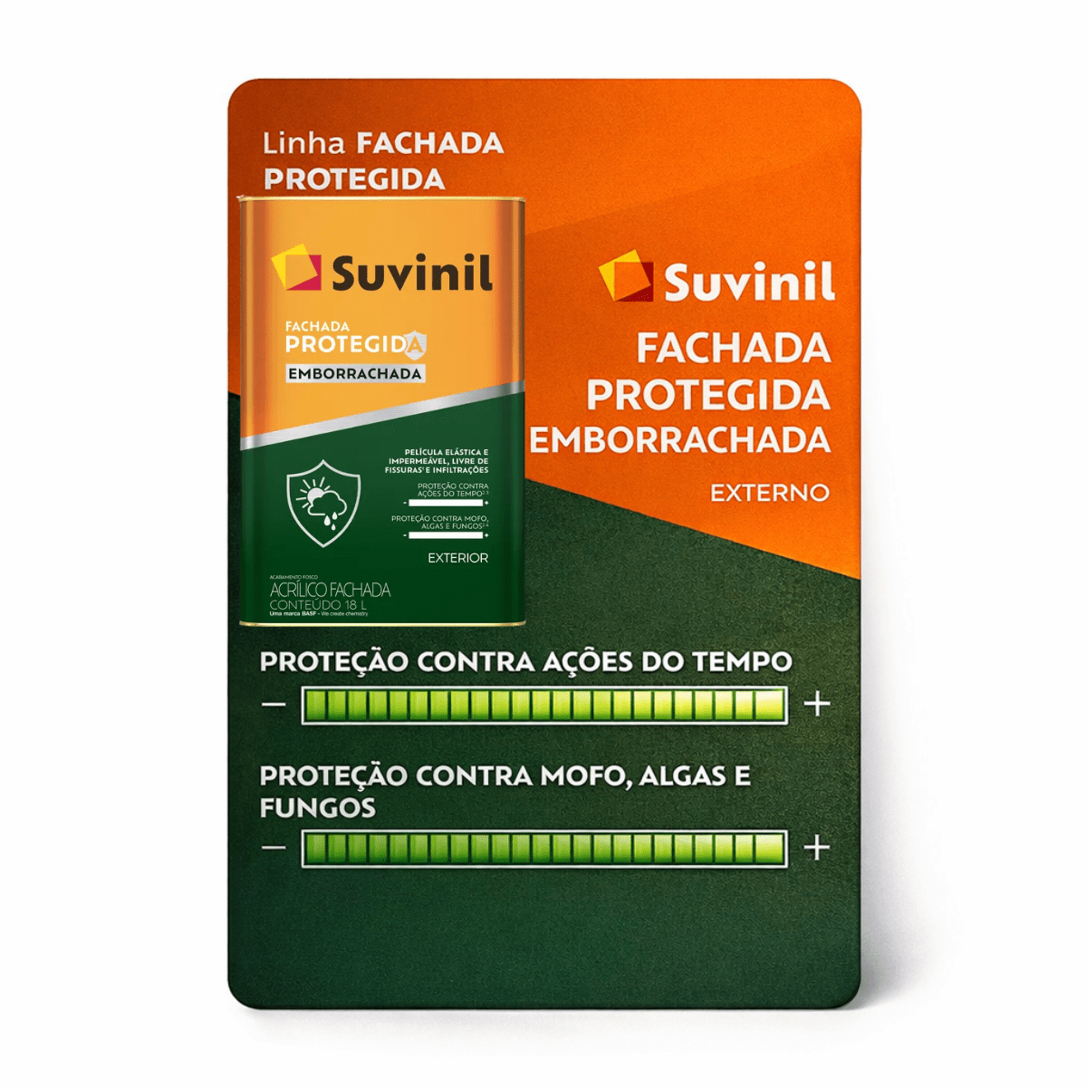 O Acrílico Fachada Protegida Emborrachada Branco 18L da Suvinil é uma tinta acrílica de alta performance, desenvolvida especificamente para a proteção de fachadas e áreas externas. Seu principal diferencial é a tecnologia emborrachada, que confere elasticidade à película de tinta, permitindo que ela acompanhe o movimento de dilatação e retração das paredes, prevenindo e tratando microfissuras de até 0,3 mm. O produto é impermeabilizante, evita infiltrações, protege contra o mofo e tem alta resistência a intempéries, com excelente cobertura na cor Branco.