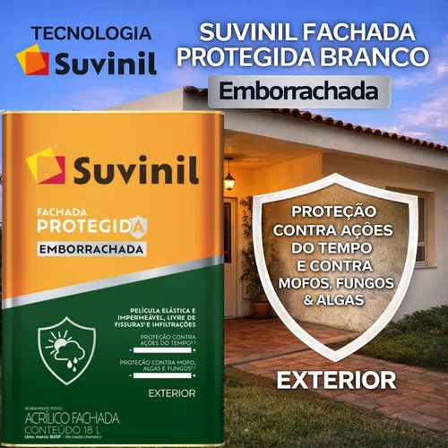 O Acrílico Fachada Protegida Emborrachada Branco 18L da Suvinil é a tinta de alta performance ideal para proteger e renovar suas paredes externas. Sua tecnologia emborrachada garante elasticidade, combatendo microfissuras e oferecendo total impermeabilidade contra a chuva.