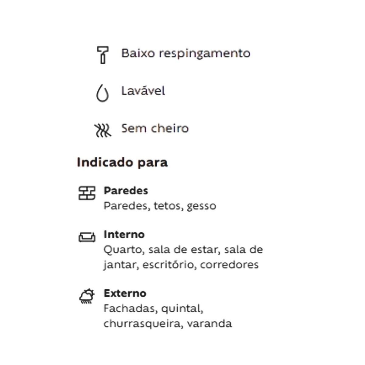 - Indicação: Superfícies externas e internas de reboco, massa acrílica, texturas, concreto, fibrocimento e superfícies internas de massa corrida, gesso e repintura sobre tintas PVA ou Acrílicas.
