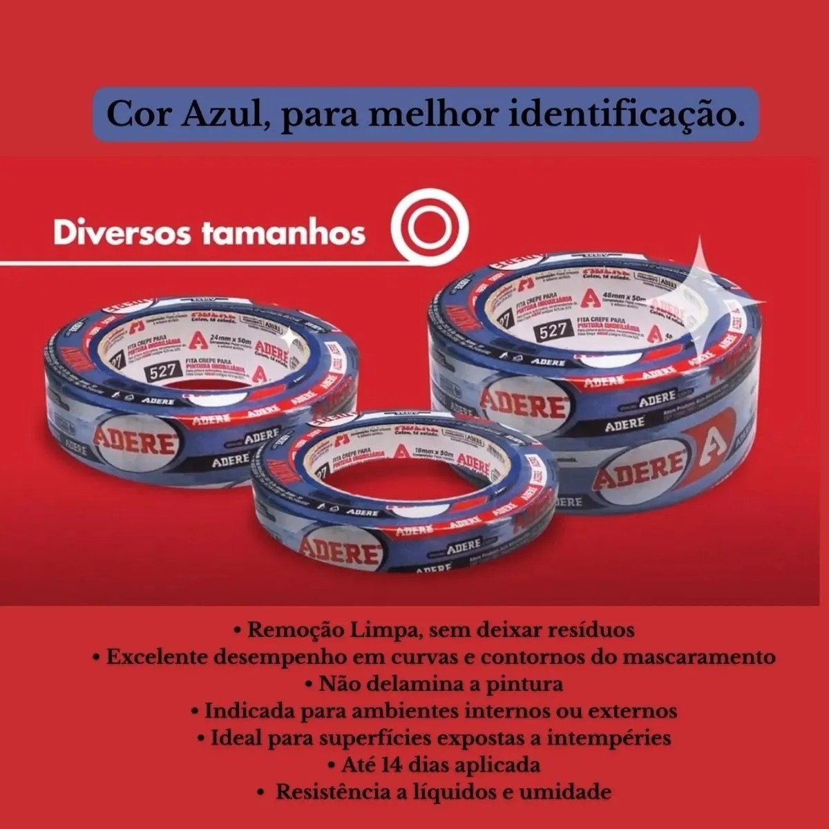 A Fita Crepe Azul 527 18 mm x 50 m da Adere é uma fita adesiva de alta qualidade indicada para mascaramento em pinturas, sinalizações, marcações e proteção de superfícies durante trabalhos de pintura e acabamento. Desenvolvida com adesivo de boa fixação, permite aplicação prática e remoção sem deixar resíduos, sendo ideal para pintura interna e externa em paredes, portas, batentes e outros elementos.