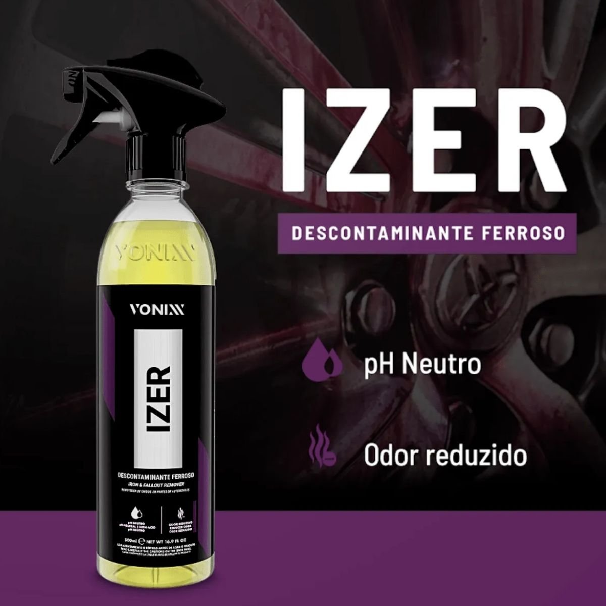 O Izer Descontaminante Ferroso da Vonixx é um produto de alta tecnologia, essencial para a remoção de partículas ferrosas e fuligem de freio que se aderem a diversas superfícies do veículo. Com pH neutro, ele reage quimicamente com os contaminantes de ferro (ferrugem e oxidação), transformando-os em uma substância roxa, o que facilita a sua remoção e evita danos à pintura, rodas e cromados.