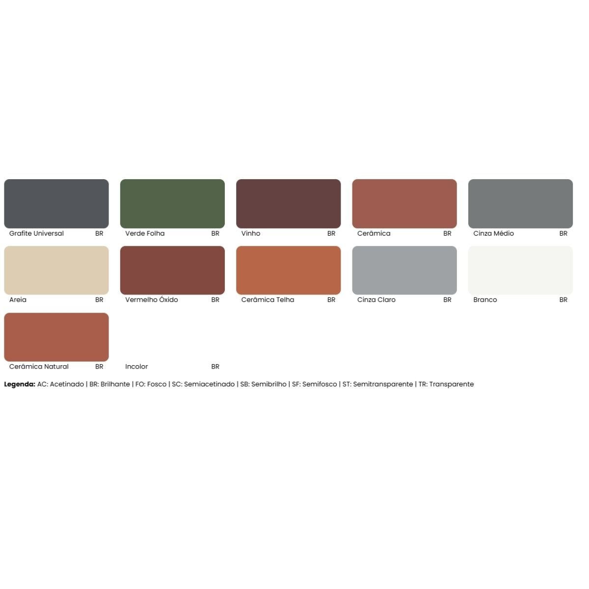 - Tempo de Secagem: Final em 12 horas. Intervalo entre demãos de 3 horas.