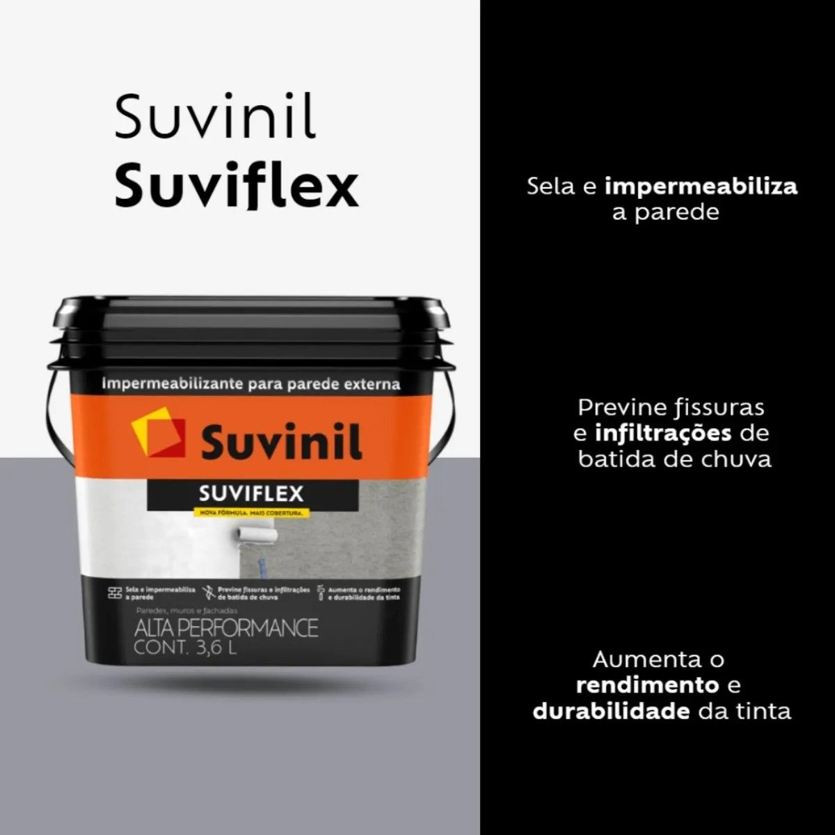 O Suviflex 3,6L Suvinil é a solução ideal para quem busca proteção eficiente contra infiltrações em áreas externas. Proporciona impermeabilização duradoura e maior segurança para lajes e paredes expostas ao clima.